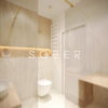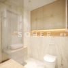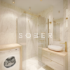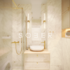 Ponadczasowa łazienka z płytkami imitującymi marmur, z armaturą w kolorze złotym i z kabina prysznicową. Niewielka łazienka w mieszkaniu o wymiarach 165 cm x 240 cm. Mimo swoich niewielkich wymiarów posiada wszystko co powinna. W tej niewielkiej łazience jest sporo miejsca do przechowywania.