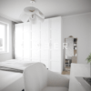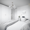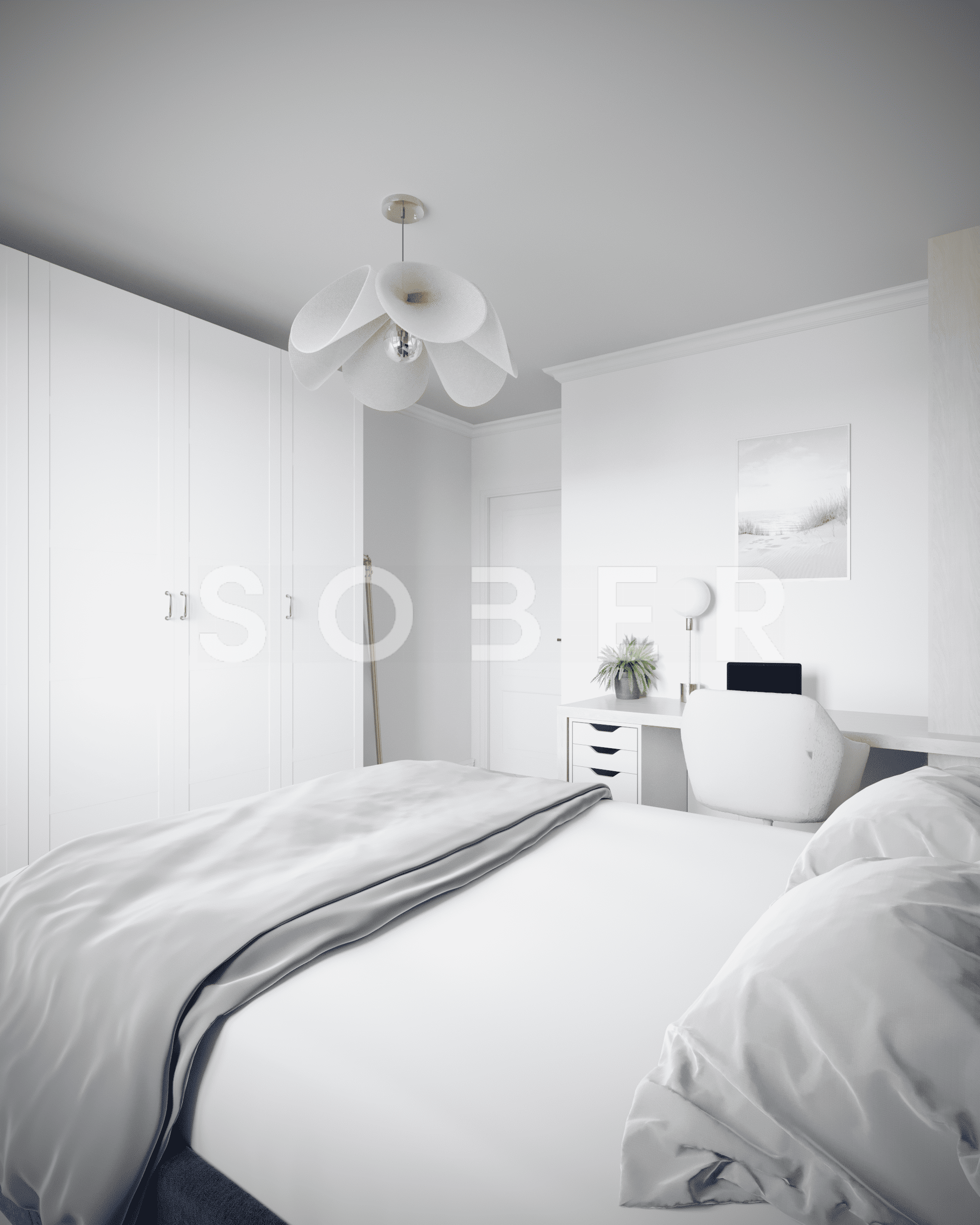Jasna, spora sypialnia, w której znalazła się oprócz łóżka szafa z firmy IKEA, biurko, toaletka dostawiona do regału na ścianie. Całość pomieszczenia ma przyjemny miły charakter, jasny. Co ważne całość nie jest droga w realizacji. Najdroższe w tym pomieszczeniu to meble, które zawsze można zmienić na inny tańszy materiał, lub zakupić później. Pokój ten ze względu na biurko / toaletkę regał i kontener może być również miłym home officem. Pomieszczenie w kwadracie o powierzchni 362 cm na 333 cm Szacunkowy koszt materiałów wykończeniowych bez mebli to 10 000 zł