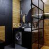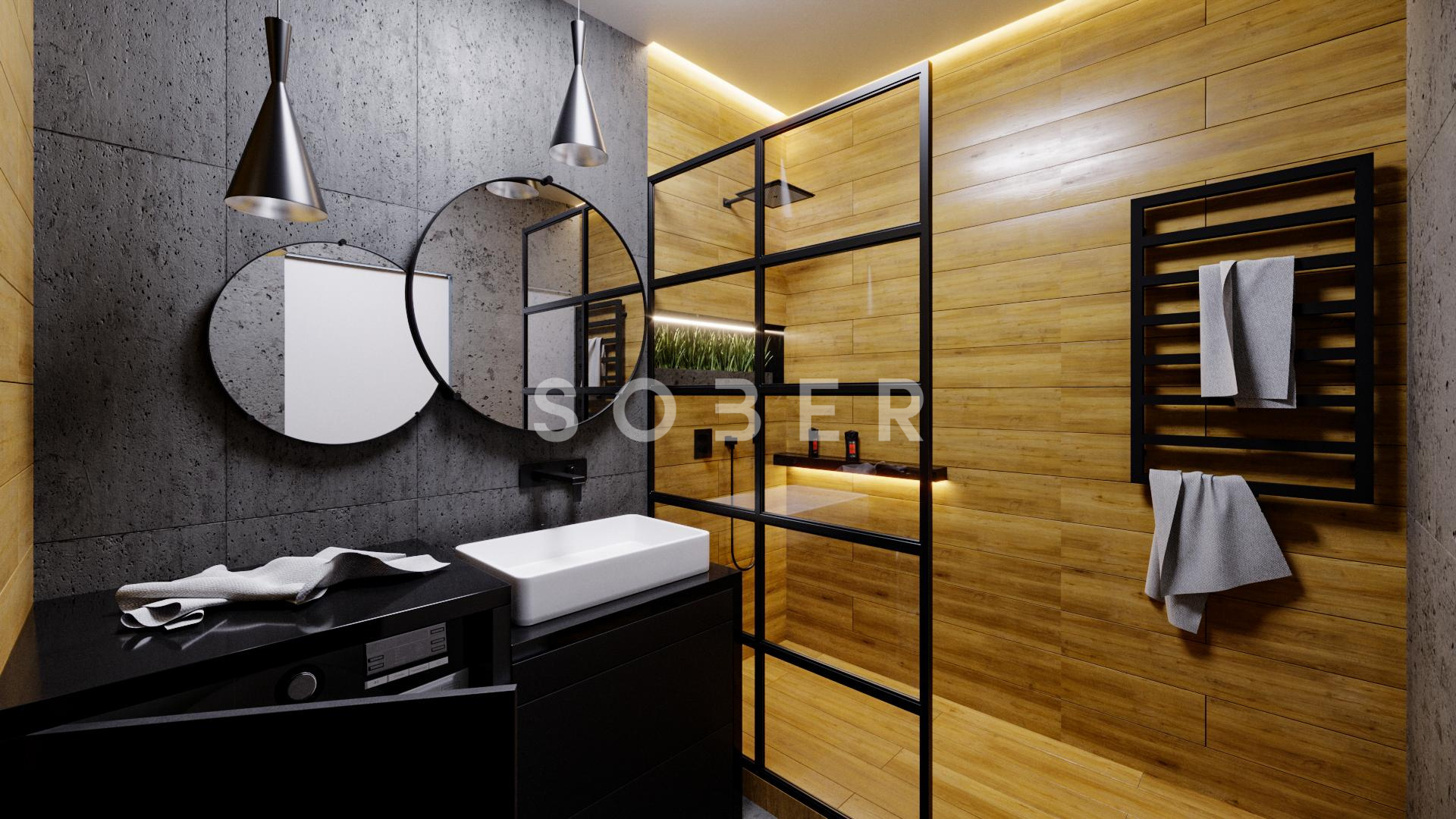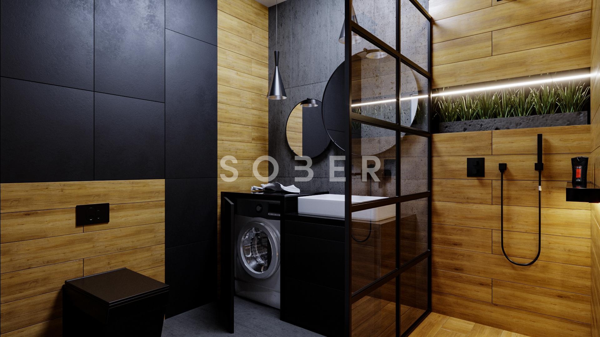 Niewielka łazienka w bloku w stylu loftowym. W ciemnych kolorach z dodatkiem drewna. łazienka ustawna, więc łatwo ją przystosować do swojego pomieszczenia, w czym możemy pomóc. łazienka z kabiną typu Walk-In (może byc kabina zamykana), oraz pralka i szafkami pod umywalką. Wymiary pomieszczenia 259 cm x 191 cm
