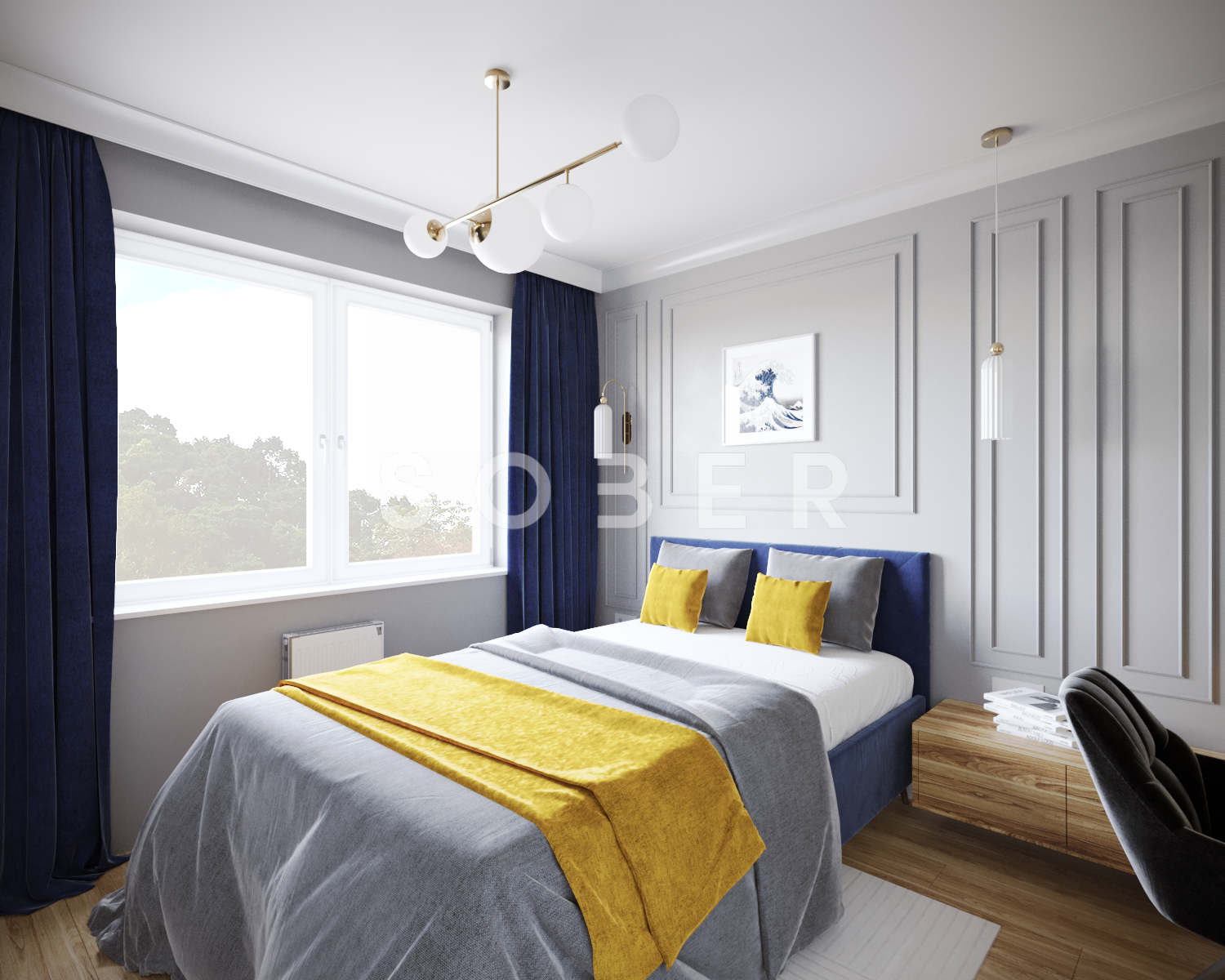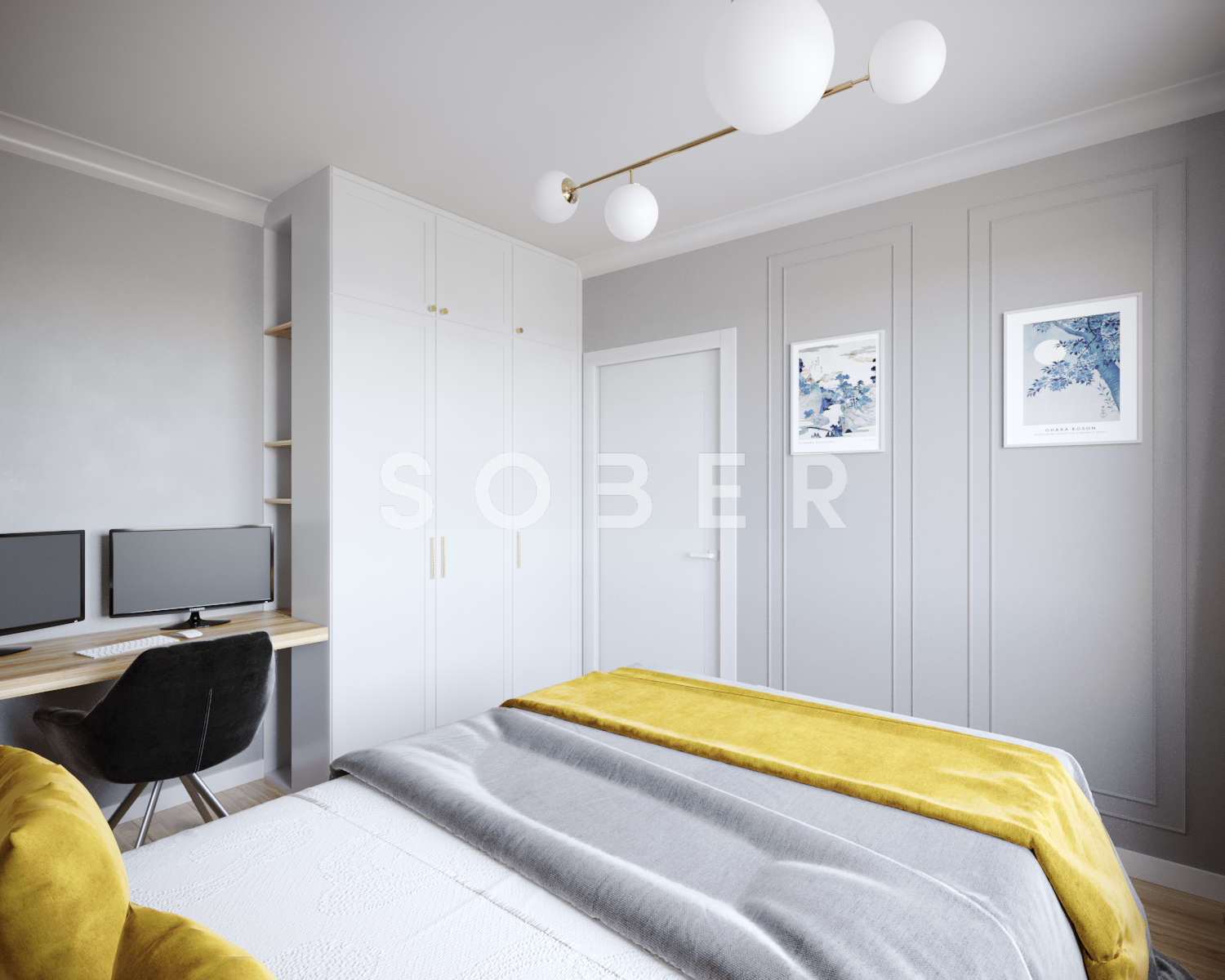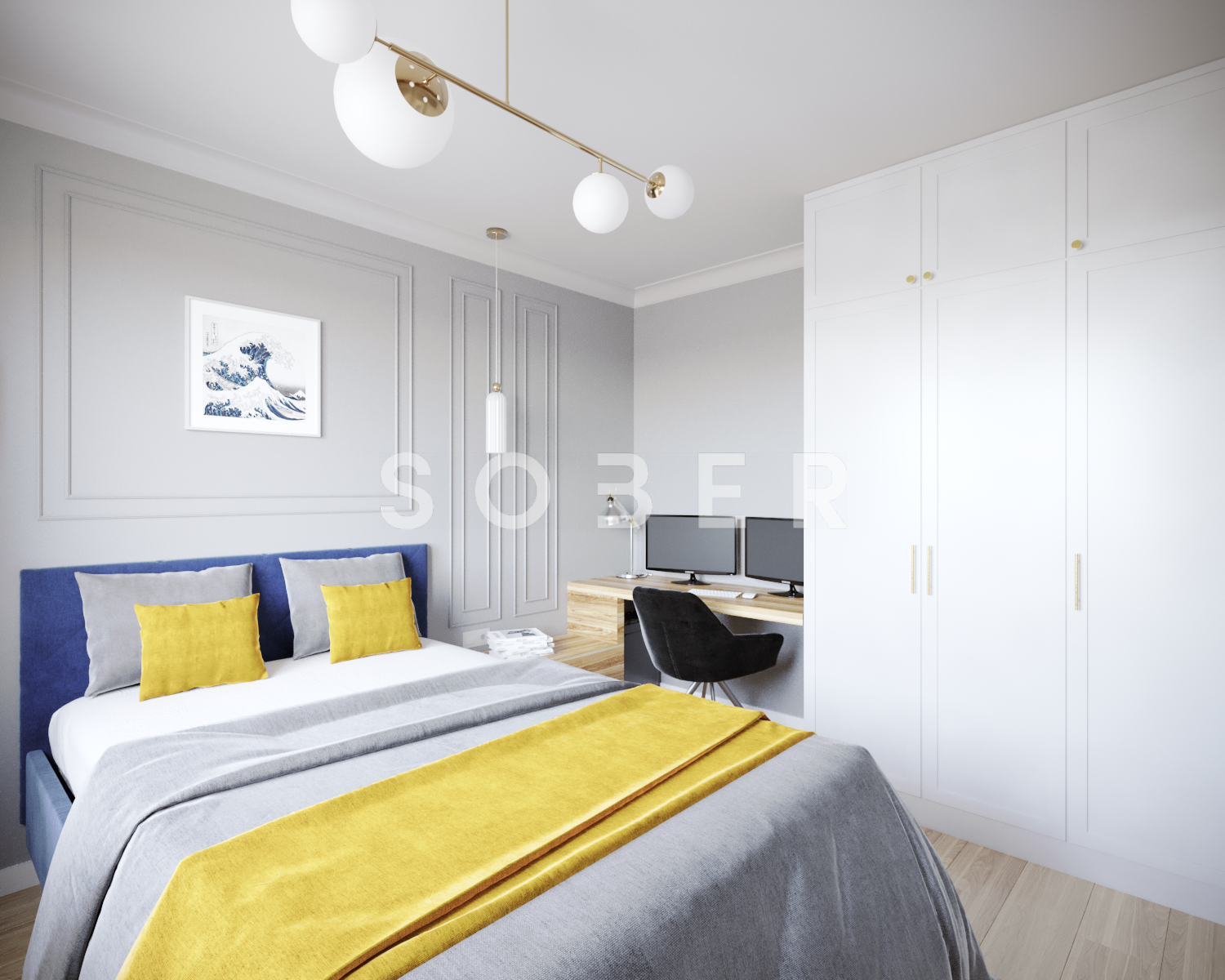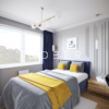 W dzisiejszych czasach dużo pracujemy w domu, dlatego zazwyczaj potrzebujemy wygospodarować miejsce do pracy. Proponujemy Wam piękną sypialnię w stonowanych kolorach, która posiada dużą szafę, lecz również nie małe biurko. Sypialnia zdobiona delikatną sztukaterią na pewno będzie zachwycać przez lata. Wymiary pokazanej sypialni 358 cm x 298 cm z mozliwością modyfikacji